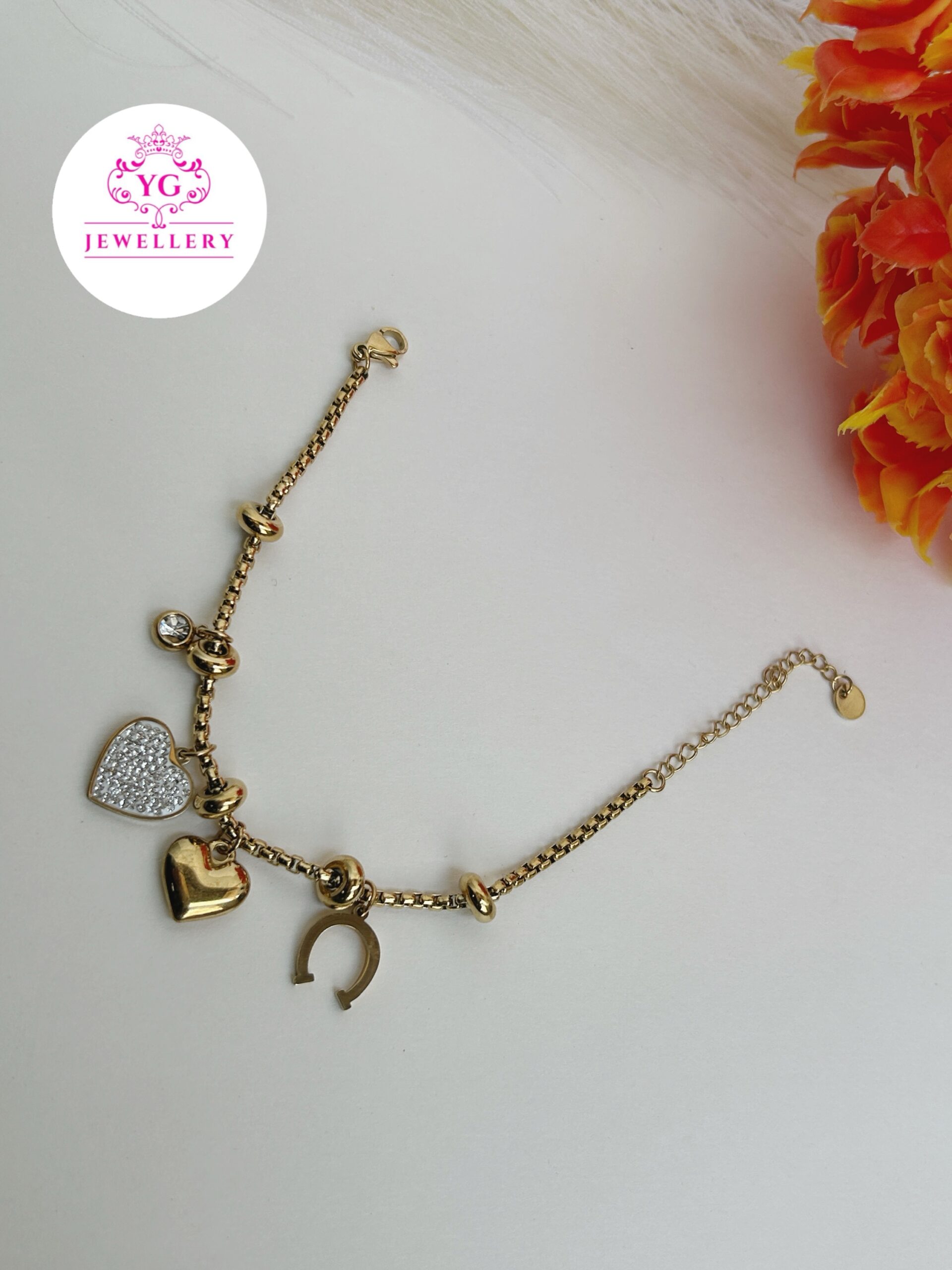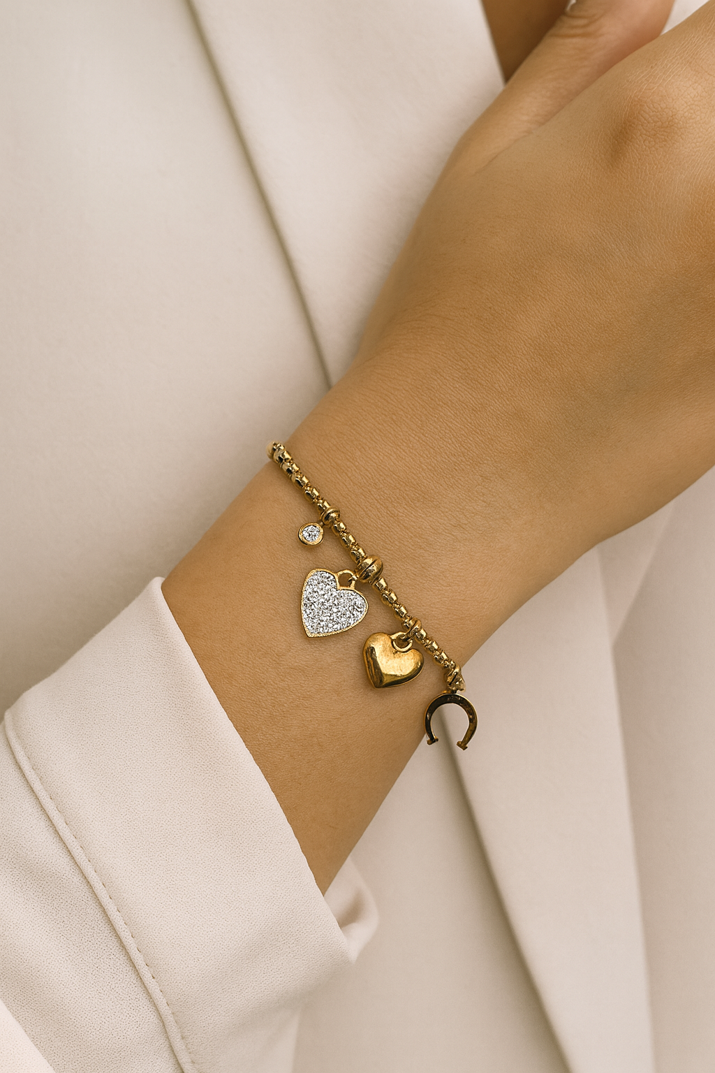 This chic stainless steel charm bracelet is crafted with high-quality, long-lasting metal that stays shiny and beautiful with everyday use. The bracelet features a mix of delicate charms — including a sparkling heart, a gold-plated heart, a lucky horseshoe, and a dainty CZ stone — all arranged on a sturdy, stylish chain.